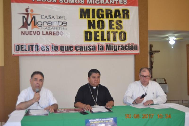 Nuevo Laredo, Tamaulipas.-Durante una rueda de prensa efectuada en la Casa del Migrante ‘Nazaret’, el obispo Enrique Sánchez Martínez dio a conocer los eventos que se van a desarrollar con motivo de la Semana del Migrante, que será del 3 al 10 de septiembre en esta ciudad, cuya finalidad será la de hacer conciencia de lo que significa la solidaridad para todos los que llegan a Nuevo Laredo en busca de cruzar la frontera, y de los deportados.
