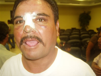 “Es un problema ejidal, un pleito de tierras”, dijo de manera breve González, quien acudió a la cita con las autoridades municipales con el rostro tumefacto y con vendajes, acompañado del secretario municipal de la CNC, Alejandro López, y del sub delegado jurídico de la Procuraduría Agraria en Tamaulipas, Saúl Pérez Alameda.