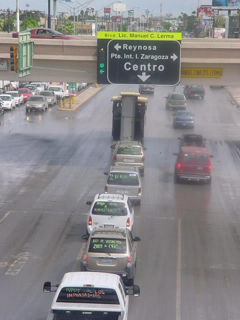 Matamoros, Tamaulipas.- Un impresionante despliegue de agentes de Tránsito Local se registró en este puerto fronterizo, tras conocerse al filo del medio día sobre una marcha pacífica que realizaron los importadores de autos usados en Matamoros y que tenían como destino final la SHCP.