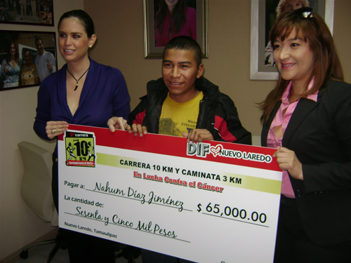 Nuevo Laredo, Tamaulipas.- Nahum Díaz Jiménez, un menor de 15 años de edad, recibió la mañana de ayer por parte del Sistema DIF, 65 mil pesos que fueron obtenidos por los donativos de la carrera ‘Corriendo hacia la Gloria’, efectuada la semana pasada, y como parte de un programa orientado al apoyo a personas que padecen cáncer.