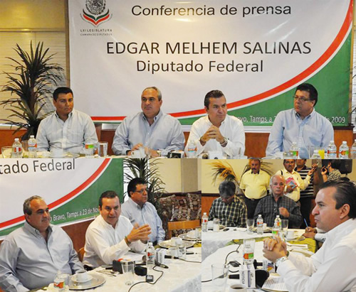 En rueda de prensa el diputado federal Edgar Melhem Salinas, acompañado del presidente municipal Roberto Benet Ramos y el ingeniero José Luis Domínguez y el regidor Juan Machuca Valenzuela, dio a conocer a representantes de los diferentes medios de información sobre los logros dentro del presupuesto de egresos de la Federación para el municipio de Río Bravo y el III distrito.