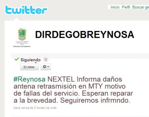 En Twitter se lee DIRDEGOBREYNOSA #Reynosa NEXTEL Informa daños antena retrasmisión en MTY motivo de fallas del servicio. Esperan reparar a la brevedad. Seguiremos informando.