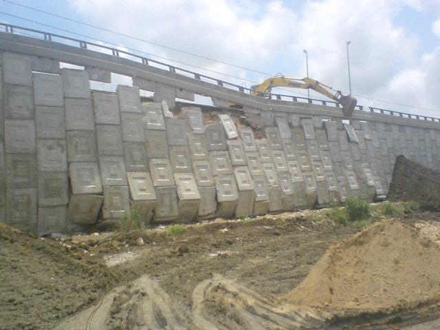 Los obreros que laboran en el paso a desnivel se dieron a la tarea de acumular arena en los costados, además de utilizar una retroexcavadora para sostener la estructura de concreto que esta a punto de caer.