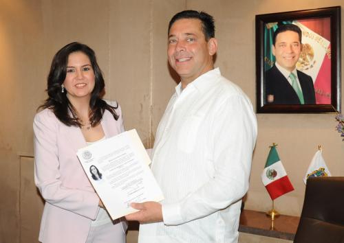 CD. VICTORIA, Tamaulipas.- Al exhortar a ejercer con honorabilidad la actividad notarial, el gobernador Eugenio Hernández Flores entregó a la abogada Melba Olga Salinas Gutiérrez la patente de aspirante a notario.