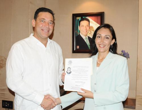 CD. VICTORIA, Tamaulipas.- El gobernador Eugenio Hernández Flores entregó a Rosa María Amín Delgado patente de aspirante para ejercer funciones de fedatario público en la entidad.