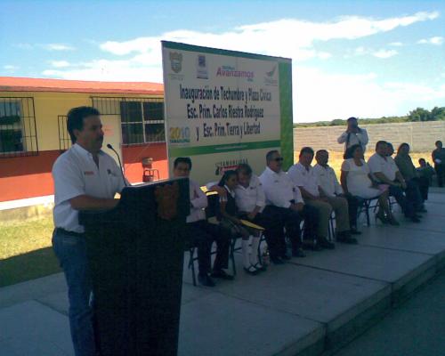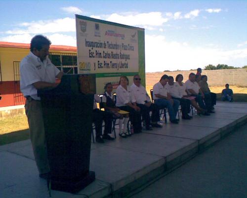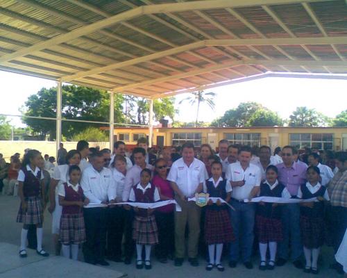 Madero, Tamaulipas.- El gobierno del estado de Tamaulipas a través del programa “Unidos Avanzamos Mas”, en coordinación con el ayuntamiento de Ciudad Madero, entregó a la escuela primaria “Carlos Riestra” una techumbre, así como también el patio cívico, obras construidas gracias a las gestiones que el alcalde Sergio Posadas hizo ante gobernador Eugenio Hernández Flores, con lo cual se beneficia a los alumnos de ambos turnos.
