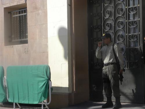 Victoria, Tamaulipas.- La entrada y salida de los cientos de tamaulipecos que a diario acuden al Palacio de Gobierno, ya no es libremente como en sexenios anteriores, ya que se ha impuesto un flitro de seguridad que desconcierta a propios y extraños,. pues hasta los trabajadores tienen que dar sus datos generales a los guardias que desde temprana hora estan en las entradas del edificio.