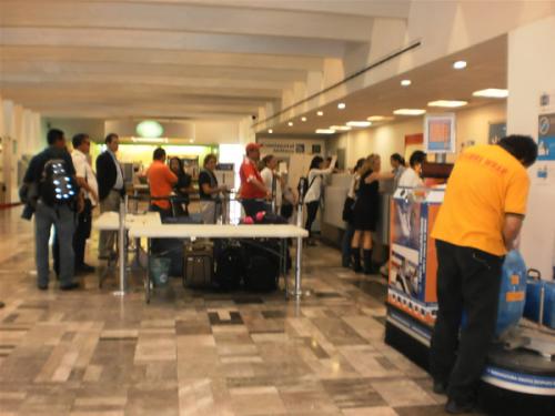Cabe mencionar que el primer vuelo que sale es el 3048 de la línea aérea Continental con destino a Houston, por lo que la gente que va a ese destino llega aproximadamente a las 5 de la mañana para realizar su documentación, después salen vuelos de Interjet y AeroMéxico, pero fue hasta las 08:45 horas cuando llegó una persona del sector salud a repartir folletos.