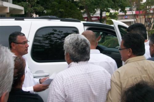 Madero, Tamaulipas.- Comerciantes ambulantes que están en contra de la reubicación, coparon la camioneta que traslada al alcalde de Ciudad Madero Jaime Turrubiates Solís, en señal de protesta ante la falta de diálogo; cerca de un centenar de personas enardecidas por la decisión de la primera autoridad tuvieron “secuestrado” por 15 minutos al Presidente Municipal que no le dejaban salir de las instalaciones del palacio.