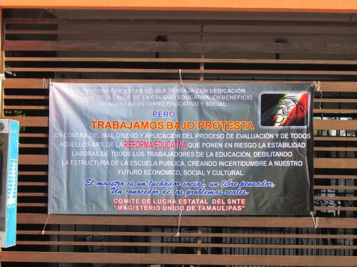 La lona, que fue instalada y amarrada entre dos postes ubicados en la acerca de la esquina que conforman la avenida Francisco I. Madero, (antes Álvaro Obregón), principal arteria de la urbe petrolera, y la calle Francisco Sarabia, dejó ver a los automovilistas y a los transeúntes que caminaban por el lugar, el desacuerdo que tienen algunas personas con el trabajo desarrollado por Rodríguez Treviño al frente de uno de los sindicatos mas importantes que tiene la entidad tamaulipeca.