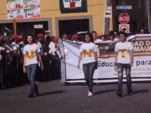 Reynosa, Tamaulipas.-La Universidad del Norte de Tamaulipas (UNT) participó en el desfile conmemorativo del 201 aniversario de la independencia de México, siendo su primera ocasión en que intervienen en este evento en Reynosa, luego de ser inaugurado el campus, apenas en septiembre del 2010.