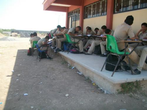 Río Bravo, Tamaulipas.-Tras lanzar un SOS alumnos del taller de tecnología electrónica de la escuela secundaria No. 4, consideran urgente la construcción de una aula, afirman que ya viene la temporada invernal y no quieren enfrentar el frio y lluvia, al participar en esta materia a la intemperie.