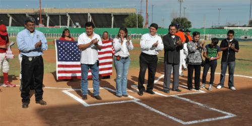 Representando al Presidente Municipal, Benjamín Galván Gómez, estuvo Anuar Kasim Terán, titular de Vinculación Municipal, en la ceremonia inaugural del partido entre la Liga Instruccional Municipal para beisbolistas de entre 15 y 18 años, contra la Selección de Béisbol de Laredo, Texas.
