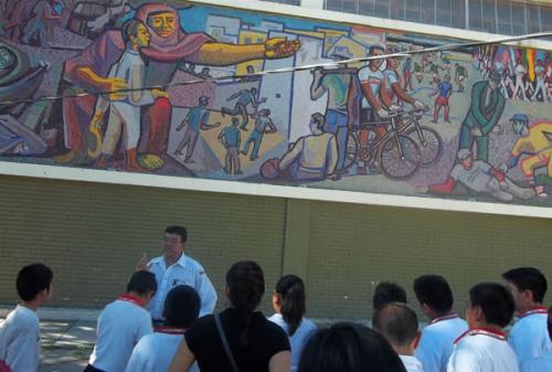 Con mosaicos de vidrios en distintos colores, y con una longitud de 66 metros cuadrados, se compone el mural titulado “Lo Social en el Desarrollo de los Deportes” ubicado en el Gimnasio de la Unidad Deportiva Lic. Benito Juárez, y el cual es promovido entre niños y jóvenes, para que conozcan más sobre la ciudad.