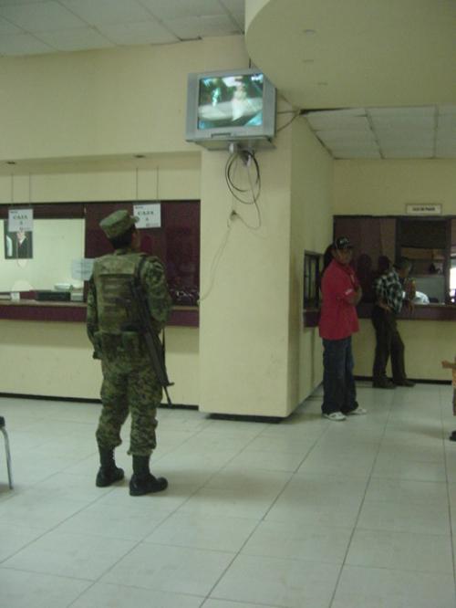 El militar quien por cierto respetamos su anonimato, se le pudo ver muy distraído y por varios minutos en la televisión del lado derecho que se exhibe en la planta baja de la Presidencia Municipal de esta ciudad fronteriza.