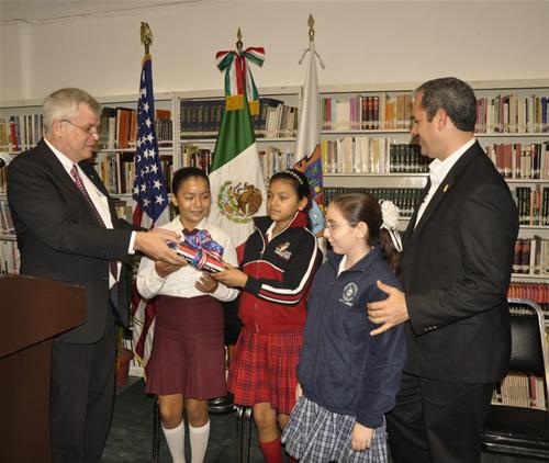 El Presidente Municipal Benjamín Galván Gómez, recibió oficialmente del Cónsul Donald Heflin, la donación de los 80 ejemplares en español, una acción que tiene como finalidad la de incrementar el acervo cultural entre los niños y jóvenes de esta ciudad.