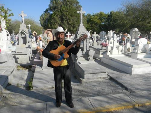 “Vengo desde hace mucho tiempo al panteón. La gente me contrata y me pide algunas canciones para recordar a sus difuntos”, explica el músico tras entonar una alegre melodía.