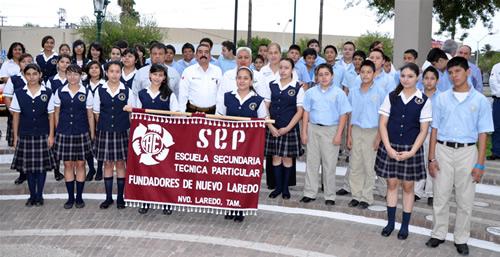 Con la participación de los alumnos de la Escuela Secundaria Técnica Privada Fundadores de Nuevo Laredo, autoridades municipales llevaron a cabo la ceremonia cívica de honores a los símbolos patrios, en este inicio de semana.
