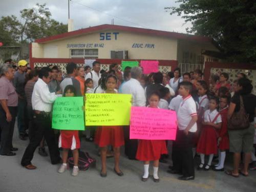 Río Bravo, Tamaulipas.- Manifestación de protesta, ante inconformidad de estudiantes, madres y padres de familia, asi como maestros de la escuela primaria de la SARH, decidieron suspender clases de manera indefinida, hasta que no obtuvieran una respuesta favorable a sus peticiones: es urgent un maestro y al ser una demanda justa y necesaria, se atendio el llamado y fue la unica forma en que pudieron llegar supervisores y autoridades educativas para dar una solucion rapida.