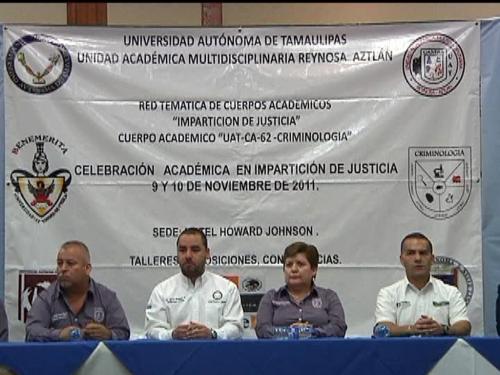 Reynosa, Tamaulipas.-En el marco de la semana de la criminología en la Universidad Autónoma de Tamaulipas (UAT), se realiza la academia de impartición de justicia, evento que tiene la finalidad incentivar la participación estudiantil para vincularse escolarmente al nuevo sistema de justicia penal.