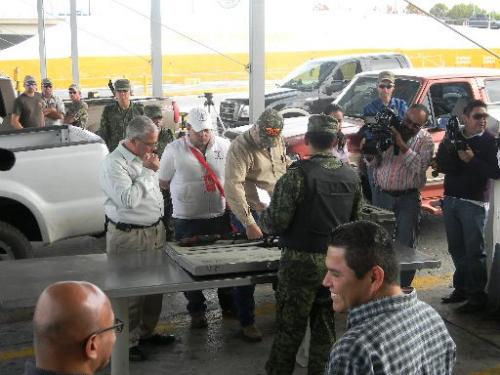 Su vehículo, una camioneta 8 cilindros 4 x 4 y torre metálica, está equipada para todo tipo de terreno, al igual que un par de vehículos en los que sus propietarios esperan turno para que sus armas sean revisadas por elementos del ejército mexicano en las instalaciones del puente internacional II.