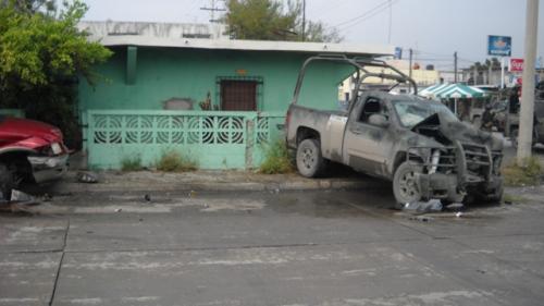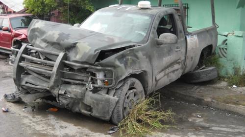La unidad militar choco contra un auto Ford Cougar modelo 2001, en color verde, y placas de circulación 2935YD del Estado de Texas, que era conducido por Alejandro de la Roja Alejo de 23 años, quien vive en la calle Mayapan No. 66 del Fraccionamiento Hogares de Matamoros, el cual resulto con golpes en varias partes del cuerpo.