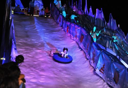 La nieve de la rampa se forma con una instalación de enfriamiento, se trituran bloques de hielo y con una manguera se llenan de agua los bloques, haciendo los canales. Luego se realizan pruebas para moderar la velocidad de deslizamiento, de acuerdo al peso de los deslizadores.