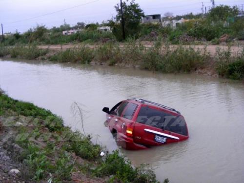 Reynosa, Tamaulipas.-Una conductora que viajaba a exceso de velocidad, termino yéndose con su unidad a un canal de riego de aguas negras logrando salvarse, ya que ese dren se encuentra lleno de agua.
