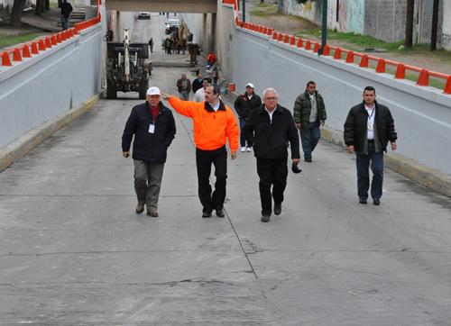 Trabajos de rehabilitación y mantenimiento general en el paso a desnivel Anáhuac, fueron supervisados por el Presidente Municipal, Benjamín Galván Gómez, durante un recorrido de trabajo en el que estuvo acompañado por el Director General de Obras y Servicios Públicos Municipales, Luis Martínez Llano.