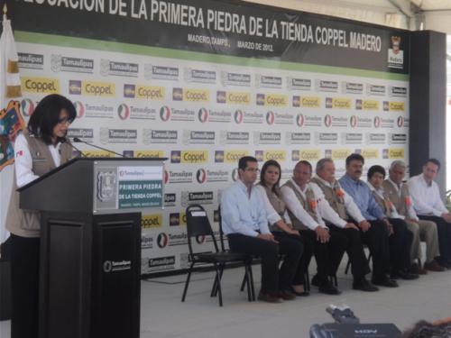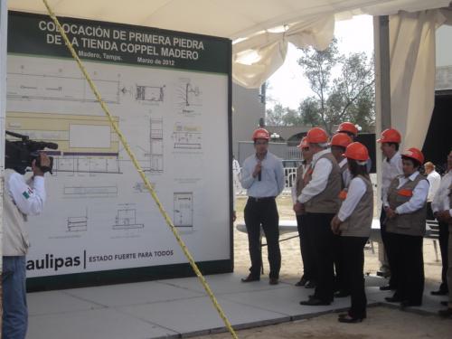 Madero, Tamaulipas.- El gobernador de Tamaulipas, Egidio Torre Cantú, realizó una gira de trabajo por el municipio de Ciudad Madero donde colocó la primera piedra de la tienda departamental Coppel que se ubicará sobre la principal avenida de la urbe petrolera, donde se invertirán alrededor de 80 millones de pesos, de los 230 que tiene en este momento dicha firma comercial aplicados en la entidad.