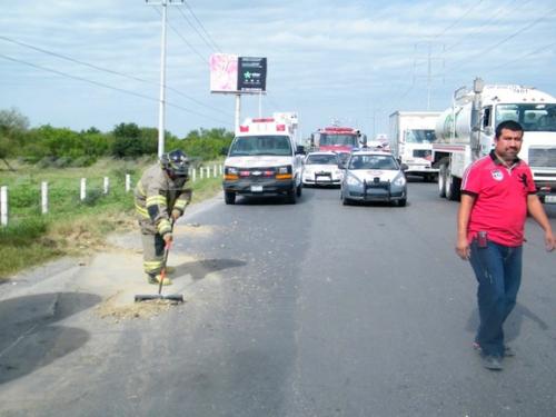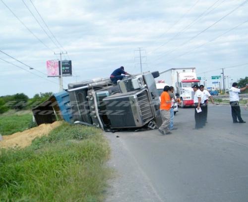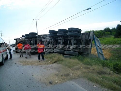 La volcadura se registro sobre la carretera Monterrey-Matamoros, a la altura del puente vehicular elevado que se encuentra frente a la colonia Jarachina Sur, donde una pesada unidad dejara cientos de caliches tirados sobre la carpeta asfáltica.