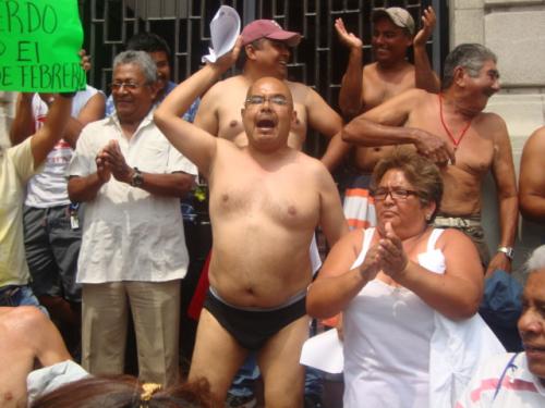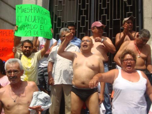 Por lo que lidereados por Rolando Santiago Aguayo, quien dijo ser uno de los principales lastimados con esta decisión y el nulo cumplimiento del acuerdo, se empezó a desnudar, quedo sólo en ropa interior y fue seguido por otras seis personas , que se quitaron las camisas , al igual que una señora de edad avanzada que se quedó con un camisón.
