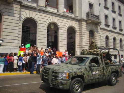 Cabe mencionar, que a había transcurrido unos veinte minutos aproximadamente de la protesta, cuando se hicieron presentes elementos polimilitares quienes se acercaron con los manifestantes para conocer el motivo de su inconformidad, y los convocaron a no desnudarse para evitar infringir el bando de policía y buen gobierno, no hubo ninguna persona detenida.