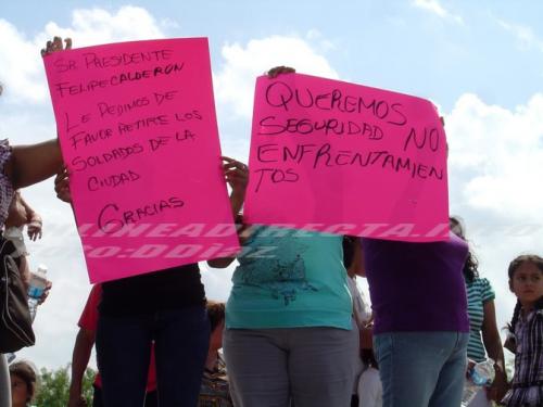 “Exigimos paz para nuestras familias, “Queremos un Mèxico sin armas por la tranquilidad de nuestras familias”, “Soldados basta de meterse a nuestras casas sin orden de cateo”, “Soldados dejen de violar y atropellar a gente inocente la sociedad pide justicia” y “Soldados dejen de llevarse gente inocente (menores de edad)”.