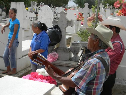 A lo lejos se escuchan las tonadas de Las Mañanitas, cantadas por el grupo ‘Amigos de Nuevo León’, quienes a petición de Elvira Guerra, quien desde el 2007 acude casi todos los días a la tumba de su madre fallecida a los 81 años de edad, siguieron con ‘Dos Coronas’ y ‘A mi Madre’, mientras los ojos llorosos de la mujer amenazaban con terminar en llanto.