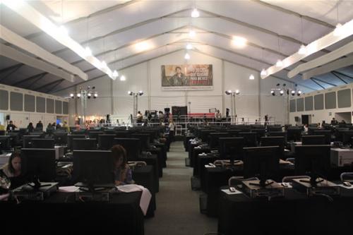 México, Distrito Federal.- La Macro sala de prensa del IFE Albergara a más de 2 mil periodistas, que se apoyaran en 45 personas del Instituto Federal Electoral para darle más funcionalidad a este espacio que cuenta además con 190 computadoras para consulta, 50 terminales para conexión de Laptop, 27 impresoras láser, 100 mesas de trabajo, 40 líneas telefónicas, 5 líneas de faxes y 20 cabinas telefónicas.