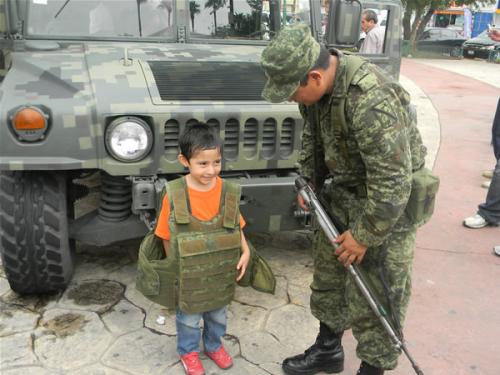 “La gente nos respeta porque sabe que estamos trabajando para ellos, y la aceptación de la sociedad es buena”, explicó, mientras a su lado unos niños se tomaban fotos al lado de unos militares, ya fuera tomando con sus manos un arma descargada, con un chaleco antibalas o arriba de uno de los vehículos.