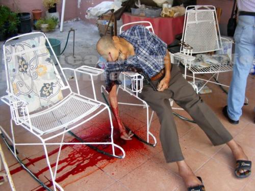 El cuerpo se encontraba en el área exterior de la vivienda sobre la terraza y se encontraba sentado en una silla de fierro, se le apreciaba un tiro en la cabeza presumiéndose que decidió quitarse la vida al darse un balazo a la altura de la cien del lado derecho y el proyectil salió en el área parental izquierdo para revotar en la pared dejando un orificio.