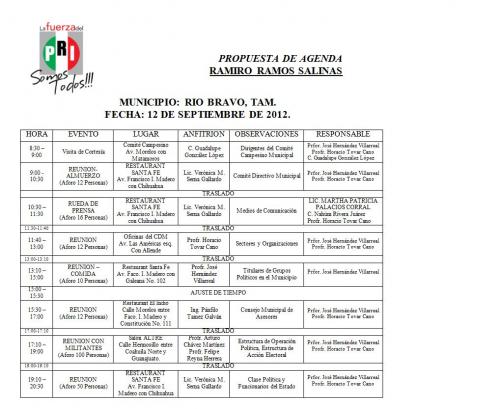 Rueda de prensa a las 10:30 en el restaurant Santa Fe; a las 11:40 reunion en las oficinas del Comité Directivo Municipal, con sectores y organizaciones; a las 13:10 reunión-comida en el restaurant Santa Fe; a las 15:30 reunion en el Restaurant El indio, anfitrion el ingeniero Pánfilo Tamez Galván, Presidente del Consejo Municipal de Asesores.
