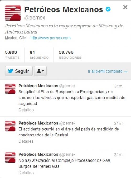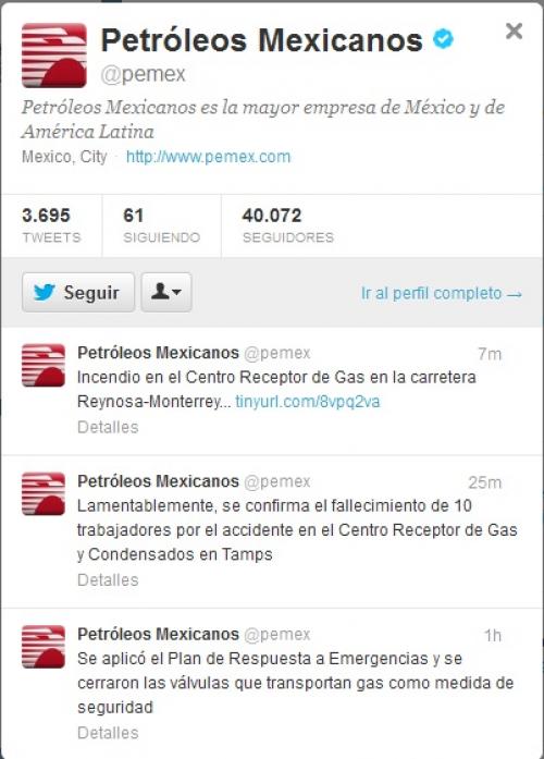 Petróleos Mexicanos ha confirmado Via redes sociales, específicamente via Twitter el fallecimiento de 10 personas en la explosión registrada a las 11 de la mañana en la Planta Criogénica de la Cuenca de Burgos.