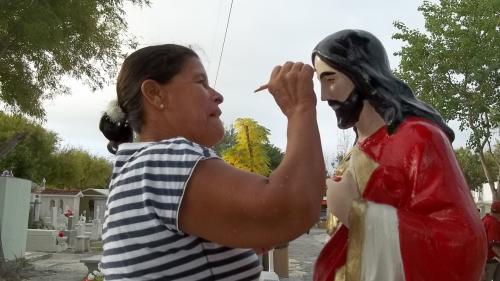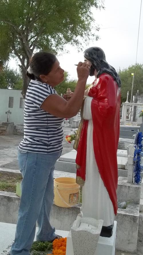 Matamoros, Tamaulipas.-Una madre de familia de la colonia Mariano Matamoros la que con sus familiares instalaron una imagen de Jesucristo en la tumba de su padre, lleva 25 años retocándola con pintura de aceite.