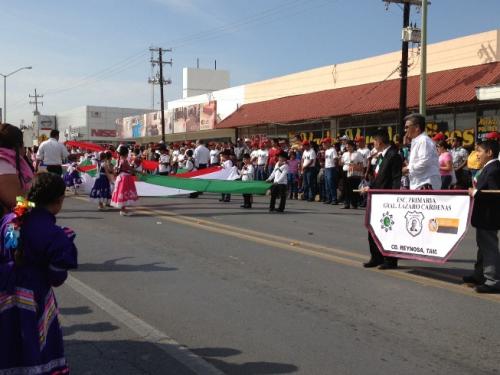 Reynosa, Tamaulipas.-Desde muy temprano miles de estudiantes s dieron cita para iniciar el desfile para conmemorar el 102 aniversario de la Revolución Mexicana, en total 45 contingentes de escuelas de nivel preescolar, primaria , secundaria y Universidad fueron quienes participaron en este evento en el que se dieron cita también funcionarios municipales y estatales.