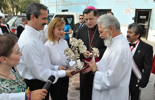 Benjamín Galván Gómez y su esposa Martha Alicia Aldapa de Galván, recibieron La Rosa de Plata, en un acto binacional encabezado por los Obispos de las Diócesis de Nuevo Laredo, Gustavo Rodríguez Vega y de Laredo, Texas, James Tamayo.