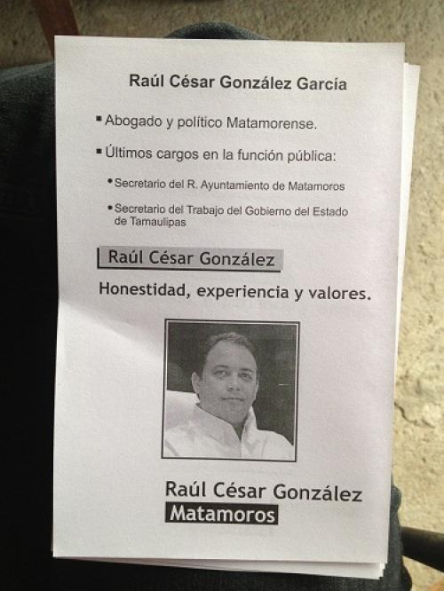 Al final de la encuesta los jóvenes encuestadores entregan un volante en donde se lee una peque;a reseña del funcionario destacando la frase “RAUL CESAR GONZALEZ, Honestidad, Experiencia y Valores”.