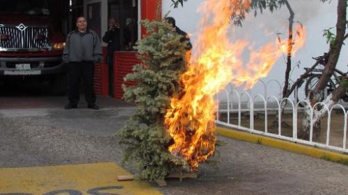 Según lo observado en un simulacro llevado a cabo en las propias instalaciones de Protección Civil y Bomberos, los pinos navideños arden completamente en cinco segundos, y según la apreciación de peritos en incendios, la habitación en donde se encuentren dichos pinos, arderá en menos de 20 segundos, por lo que la respuesta del cuerpo de bomberos deberá ser muy rápida para evitar que se incendie toda la casa.