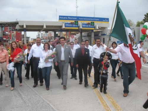 Río Bravo, Tamaulipas.– Tras felicitar al Presidente Municipal MVZ José Dolores Rodríguez Villarreal , por el éxitoso festival del “Día del Turista”, turistas de los Estados Unidos y Canadá, agradecieron la invitación al mega evento del “Día del Turista 2013” en la Villa de Nuevo Progreso; en donde se contó con la presencia de artistas de fama internacional; el saludo de hermandad se llevó a cabo enmedio del cruce internacional “Lucio Blanco” este 21 de marzo. Todas las familias que arribaron este día caminaron por las calles de esta zona turística dentro de un clima de total tranquilidad, realizaron sus compras, disfrutaron de los diversos platillos elaborados con las mejores recetas de la gastronomía mexicana, acudieron con el dentista, con el médico y regresaron a su lugar de origen, sin contratiempo alguno, muy contentos por el trato amable y el “apapacho” de que fueron objeto de parte de las autoridades y el comercio en general.