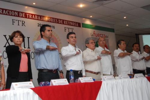 Reynosa, Tamaulipas.-Al concluir los trabajos del XVII Congreso Ordinario de la Federación de Trabajadores de Reynosa (FTR). Reynaldo Garza Elizondo, rindió protesta estatutaria para un nuevo periodo de 3 años al frente de la central obrera en Reynosa. Asistiendo la clase política y social, así como los delegados y dirigentes de sindicatos, así como trabajadores e invitados especiales en este evento.