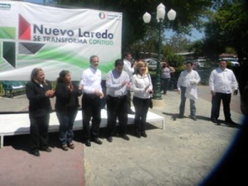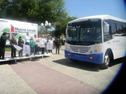 Nuevo Laredo, Tamaulipas.-Como parte del programa de renovación del transporte público en esta ciudad, otras cinco nuevas unidades fueron puestas en marcha al mediodía de ayer por el presidente municipal Benjamín Galván Gómez, quien dio el banderazo inaugural en la plaza Esteban Baca Calderón.