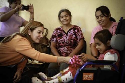 Esta intensa gira de trabajo culminó de modo muy especial con la visita de la Presidenta del Sistema DIF estatal al domicilio de Ivette, una chiquita de apenas 5 años de edad que padece parálisis cerebral infantil, a quien obsequió de forma personal una silla de ruedas pci adecuada a su discapacidad que servirá para mejorar su calidad de vida; una muñeca y dulces que hicieron alegres los ojitos de la menor.