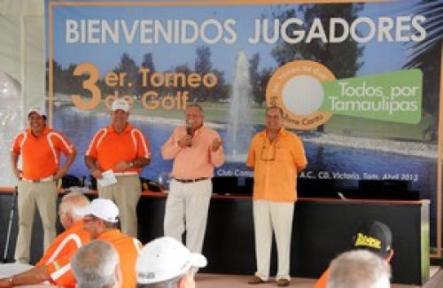 CD. VICTORIA, Tamaulipas.- El sábado 27 de abril en las instalaciones del Club Campestre Victoria AC, se llevó a cabo el tercer Torneo de Golf “Todos por Tamaulipas” Ing. Egidio Torre Cantú, patrocinado por Grupo Jebla y organizado por José Ángel Cárdenas del Avellano, Jesús Serna Barella y Antonio Casillas. Se contó con una asistencia de 110 golfistas victorenses y se jugó la modalidad de “Florida” en equipos de 5 jugadores, comenzando el torneo en punto de las 8:45 a.m.